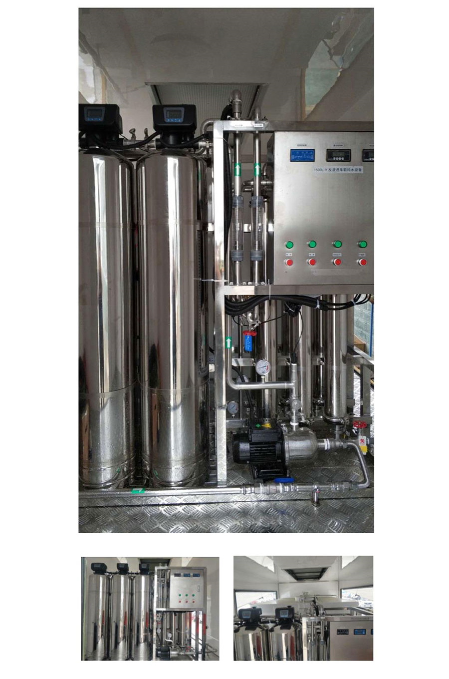 该车水净化系统采用全膜法去离子系统(全膜法除盐系统)。本系统以双级RO反渗透装置为脱盐工艺,MF微滤装置、UF超滤装置为预处理,保证反渗透系统的正常运行。UV紫外线杀菌装置和终端MF微滤装置为产品水的杀菌和热原很终处理工艺,确保经过处理后的水质达到《**生活饮用水卫生GB56749-2006》指标。本系统采用人机界面和PLC自动**,MF装置、UF装置、RO装置以及各种工艺泵均同PLC自动操作。