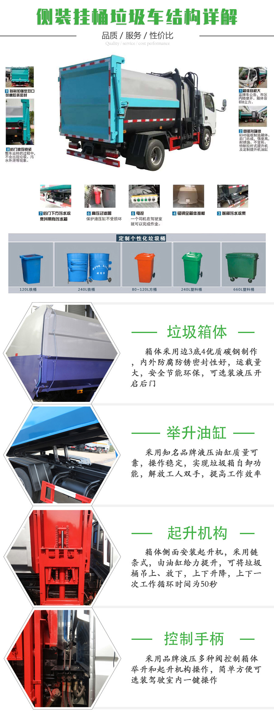 特点 | 通过副驾一侧的提升机,将240L塑料垃圾桶垃圾提升至垃圾收集口,实现对垃圾的装载及卸料作业功能; | |