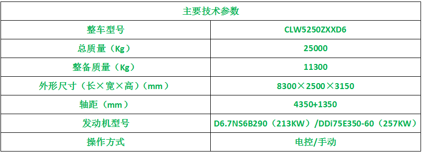 驾驶室D320排半豪华KL标准顶,发动机D6.7NS6B290,康明斯290马力,后处理U型,9JS119TA法士特9档变速箱,轴距4350+1350,轮胎11.00R20 18PR,前后桥5.5T、10T单减,板簧3/10,车架300×90×8+6,有电动玻璃,车门锁中控-遥控,有空调,油箱钢350L