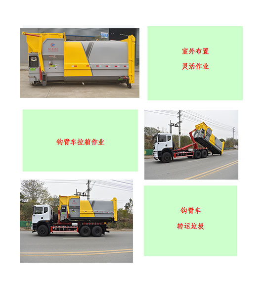 移动式压缩转运箱为我公司引进德国技术而研发的新一代垃圾压缩处理设备,该设备由垃圾储存箱、压缩机构、翻斗机构、电液控制系统等组成,配套拉臂车移动使用。设备具有结构紧凑、布置灵活、操作方便、不需建设厂房和基础等特点,适用于街道社区、医院、学校、公园、广场等各种垃圾收集转运的场所,是城市环卫部门、各种企事业单位垃圾处理装备的一种理想选择。