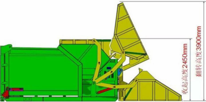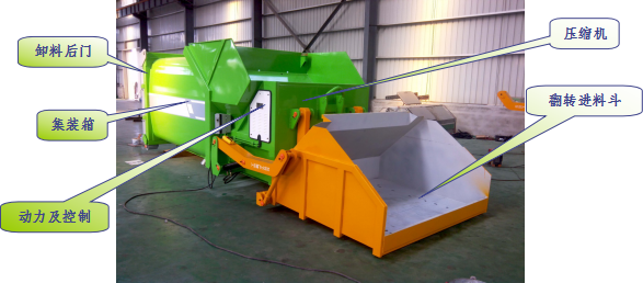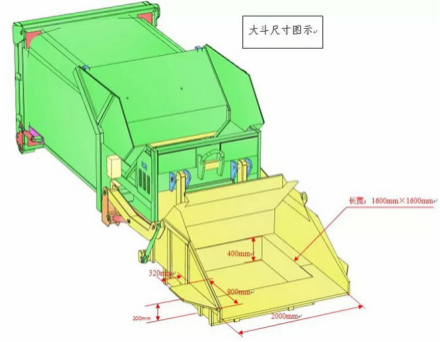 1、翻料斗:垃圾的装填容器3m3,可将翻料斗内的垃圾倾倒入压缩腔的机构;