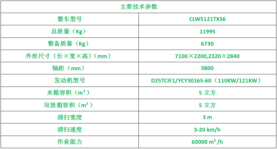 上装配置:带2个中置扫盘;中置超宽吸嘴;双层吸尘筒;江铃增压副发动机;台湾液压阀;大力马达;德国品孚高压水泵;威龙低压泵(气动前冲);3mm不锈钢垃圾箱;不锈钢水箱;德国控制器;尾部箭头灯;机油、垃圾箱、水箱均带防溢或低位报警装置;倒车及洗扫状态室内监视器;多种语音提示;防倾倒垃圾翻车保护、检修安全保护;20m高压冲洗卷盘;刷臂转动机构使用德国进口高新耐磨工程隔套,免打黄油;精密冷弯无缝液压油管;CAN总线运动控制器一键电脑控制,多达16条的语音提示或报警。洗扫宽度3.2m;吸入粒度φ110mm。