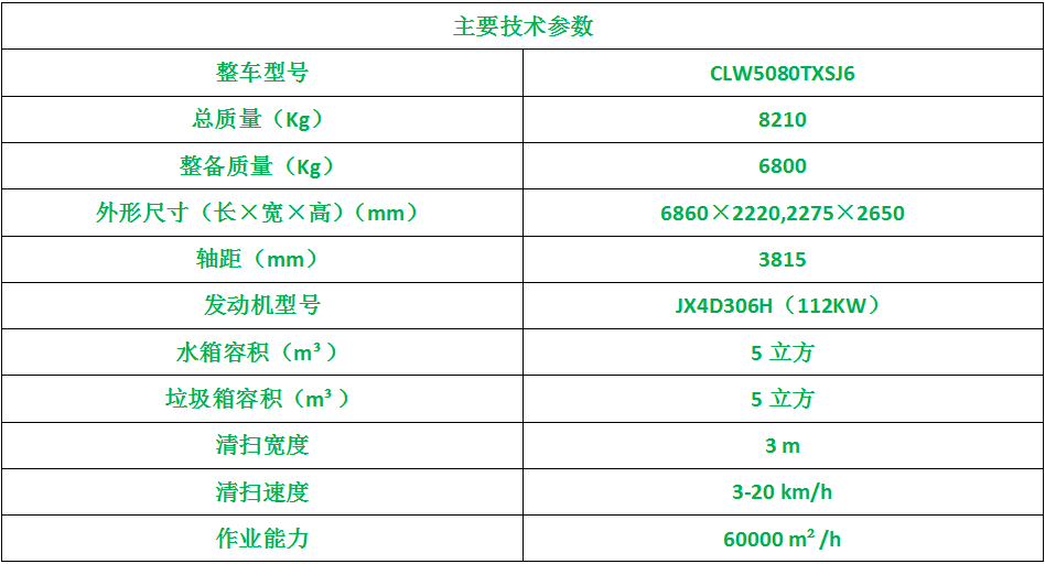 上装配置:带2个中置扫盘;中置超宽吸嘴;双层吸尘筒;江铃增压副发动机;台湾液压阀;大力马达;德国品孚高压水泵;威龙低压泵(气动前冲);3mm不锈钢垃圾箱;不锈钢水箱;德国控制器;尾部箭头灯;机油、垃圾箱、水箱均带防溢或低位报警装置;倒车及洗扫状态室内监视器;多种语音提示;防倾倒垃圾翻车保护、检修安全保护;20m高压冲洗卷盘;刷臂转动机构使用德国进口高新耐磨工程隔套,免打黄油;精密冷弯无缝液压油管;CAN总线运动控制器一键电脑控制,多达16条的语音提示或报警。洗扫宽度3.2m;吸入粒度φ110mm。