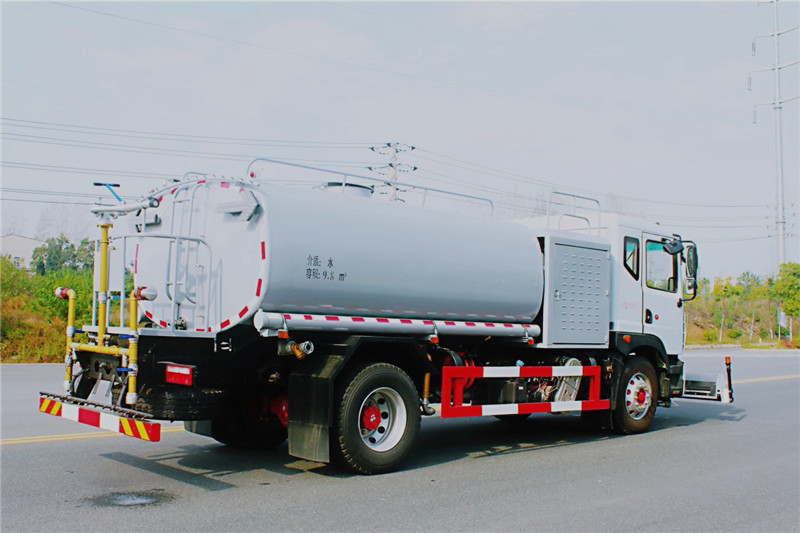 东风D9高压清洗车是一种双发动机、双水泵清洗车,是在标准二类底盘的基础上,加装高压冲洗系统、低压冲洗系统,由机械、液压(气路)、电器三部分合为一体的专用冲洗作业车。本车具有独立的高、低压两套水路系统,为清洗车工作提供压力水源。其工作原理是:利用高压水泵产生的高压水,经喷水架的高压喷嘴喷出,利用高压水流的动能,以高压力、低流量的方式进行清洗,强力去污,高效节水,能将路面的陈旧污渍清洗干净;或高压水经左(右)角喷喷出,清洗路缘、人行道及护栏隔离区;使用高压喷枪还可清洗路标、广告牌、高架路等;喷雾系统具有强大的喷雾降尘、喷撒空气消毒剂及调节空气湿度功能。