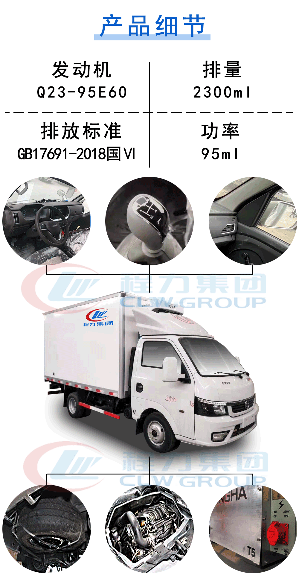 | 其他 | ABS型号/厂家:APG3550500A/浙江亚太机电股份有限公司,侧面及后下部防护装置材料为Q235,与车架采用螺栓连接.后下部防护装置断面尺寸(mm):100×50,离地高度:480mm,Q23-95E60发动机的油耗值为11.3,车厢顶部封闭,不可开启.随底盘选装后视镜,外形尺寸长-轴距-前后悬的对应关系:5430-2800-1181/1449,5730-3000-1181/1549,5995-3200-1181/1614,可选装单侧门或双侧门及选装导流罩,选装内置冷藏机组.可选装功率相当的其它型号的制冷机组.选装ABS厂家及型号:襄阳东风隆诚机械有限责任公司/ABS/ASR-12V-4S/4M. | ||